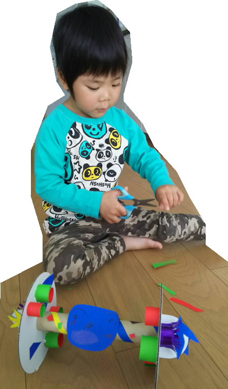未就学児の母親です。まだ、4歳なので何かテーマを与えて工作させたわけではなく、工作キットに書かれているイメージを見ながら、子どもが想像しながら作品を作りました。どうしてもうまく切れない部分に関しては、イメージを聞きながら補助をしました。子どもの想像なので、どんな作品になるのか楽しみながら見ていました。工作時間は40分ぐらいかかりましたが、楽しそうに集中しながらハサミやのり、セロテープを使っていました。車軸の部分に自分の顔を書いて貼っていたことについて聞くと「僕がコロコロする」と言っていました。自分に見立てているんだなぁと。子どもの想像力には、いつも驚かされます。