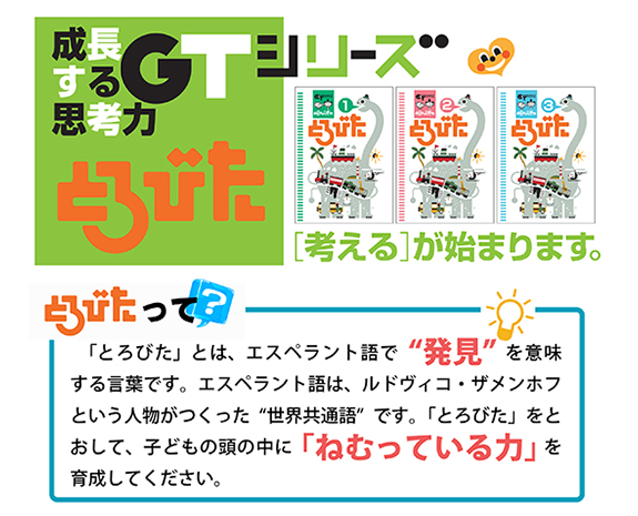 - 「成長する思考力GTシリーズとろびた」は「考えること」の大切さを問題をとおして育むことによって、「考える」ことを身につける教材。全国の幼児教室、学習塾でご利用いただいています。